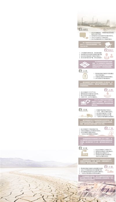 長江江蘇段分布有30個集中式飲用水水源地,現場抽查12個,8個存在環境違法問題;江西省水利廳亂作為,2015年在鄱陽湖批準3個采砂區,其中有6.82平方公里位于鄱陽湖銀魚產卵場省級自然保護區內;河南2015年全省PM10、PM2.5濃度在全國31個省(區、市)排名分別位列第三和第一,2016年上半年,均位列全國第二;2012年至2014年,江西省樂平市政府違反《排污費征收使用管理條例》,居然多次用財政資金為36家企業代繳排污費1147萬元。