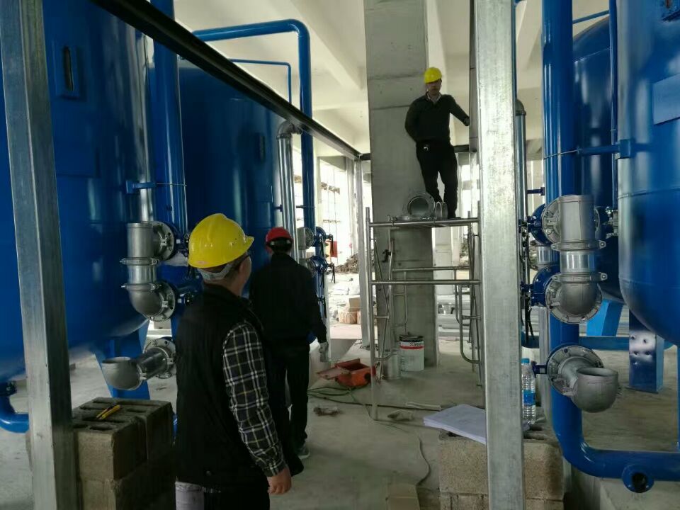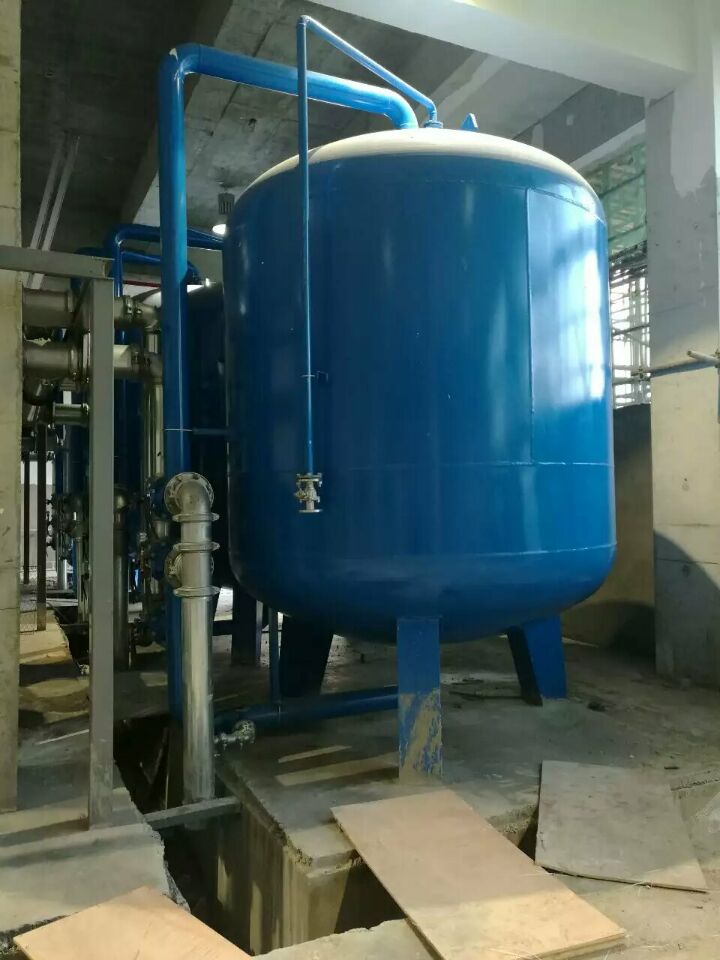蘇州榮軒環保設計的這套自來水預處理設備,主要目的是去除原水中的懸浮物、膠體、有機物和余氯等妨礙后續反滲透運行的雜質,自來水首先進入砂濾罐:φ2.6m*4.4(總高),垂高2.0m,鋼板厚度10mm,級別Q235,內表面襯膠防腐5mm,外表面SA2.5級噴砂除銹至金屬光澤后,噴涂阿克蘇諾貝爾油漆。內部填充粗細粒徑石英沙,石英砂過濾器主要去除水中的懸浮物和膠體,水中大部分懸浮物和膠體在經過濾料截留而去除。